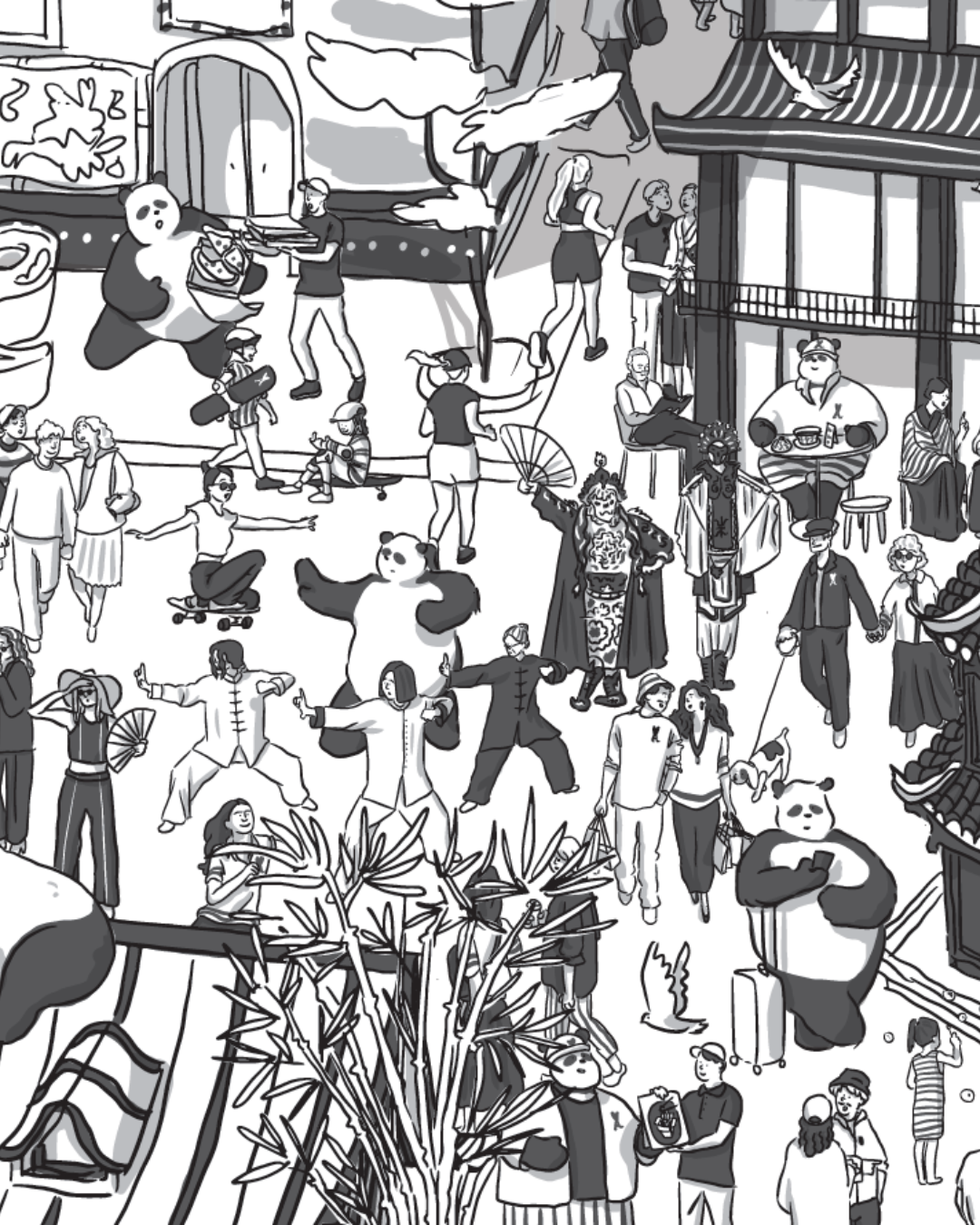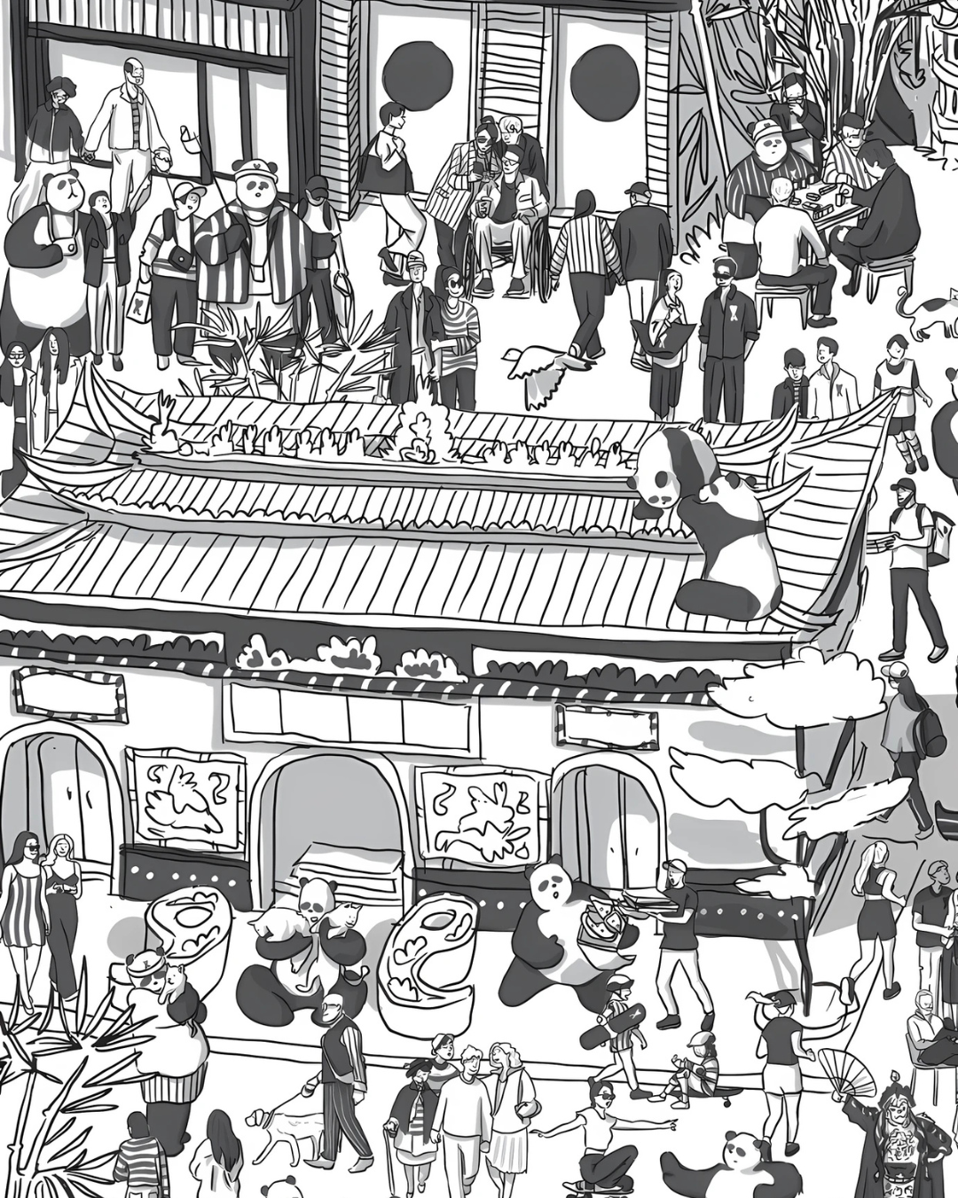 Neuf pandas pas comme les autres y ont été glissés parmi une profusion de détails.